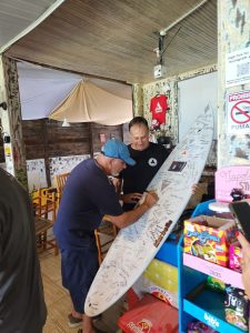 A reunião reúne amigos que cresceram juntos dentro e fora do mar, dividindo ondas, aventuras e momentos que marcaram uma época em que o surf ainda dava seus primeiros passos no litoral catarinense. Hoje, décadas depois, os encontros servem para matar a saudade, relembrar histórias e fortalecer laços que resistiram ao tempo. O restaurante escolhido para sediar as reuniões tem um significado especial: o proprietário também faz parte do grupo e mantém no local uma prancha assinada por toda a turma — uma verdadeira relíquia afetiva que carrega nomes, memórias e homenagens, inclusive de surfistas que já partiram.
