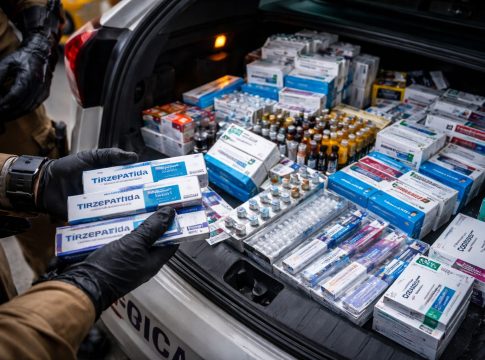 A abordagem ocorreu no momento em que o homem realizaria a entrega das substâncias. Com ele, os policiais encontraram frascos de tirzepatida, medicamento utilizado como caneta emagrecedora. O suspeito confessou a prática e indicou outros locais onde mantinha os produtos.